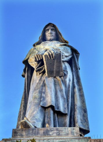 En av de mange som måtte bøte med livet på denne plassen var Giordano Bruno. Han ble født utenfor Napoli i 1548, studerte teologi og ble viet til prest i 1572. Han tilhørte dominikanerne. Hele livet hadde han følt seg litt utilpass. Han sa selv at han «hadde knappet den første knappen feil og siden kunne ingen av de andre heller knappes riktig». Til tross for at han hadde Kopernikus som læremester, var han nok ikke noen stor vitenskapsmann; han var ikke tilhenger av en vitenskapelig tilnærming til et problem.